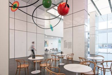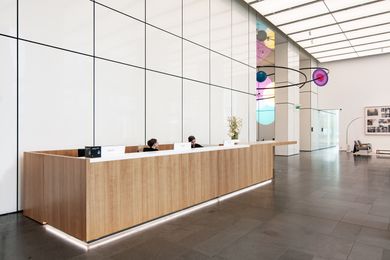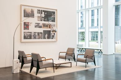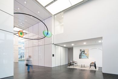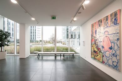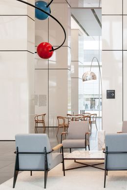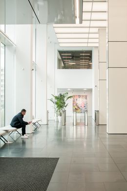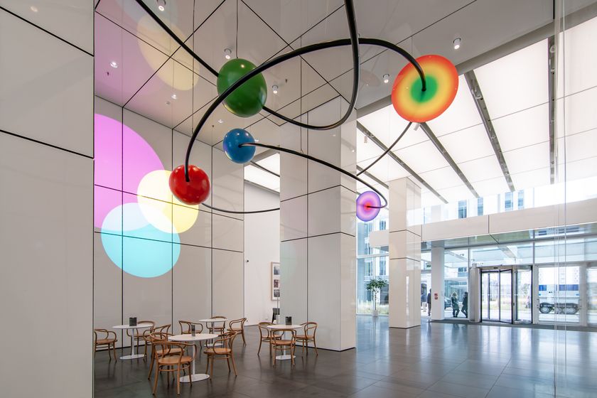 Vznosné bílé prostory lobby nejvíce ze všeho připomínají galerii, a tak jsme navrhli tento pocit posílit a rozmístit do lobby moderní umění. Čestné místo zaujímá originální koláž od Richarda Meiera, vytvořená přímo pro toto lobby. U výtahů je neustále se měnící expozice současných českých umělců a nad hlavním koridorem je umístěná rozměrná plastika od Pavly Scerankové a Dušana Záhoranského „Sluneční hodiny“, která vnáší do prostoru dynamiku a barvu.